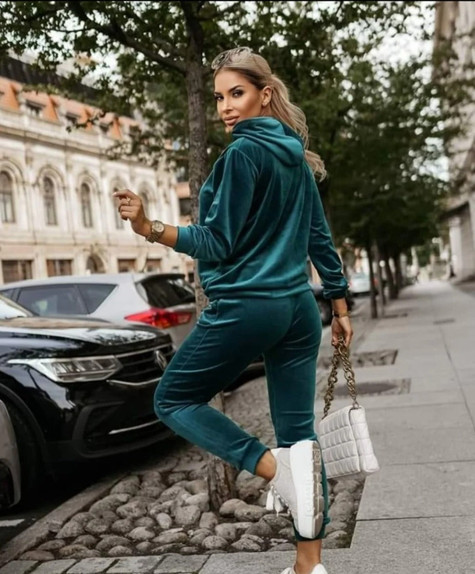 Trening din catifea supersoft, extrem de plăcut la atingere, cu textură fină și elastică, ideal pentru confort zilnic. Croială modernă, lejeră, ce oferă libertate de mișcare, iar aspectul catifelat îi conferă un plus de eleganță. Perfect pentru ținute casual sau relaxare acasă.